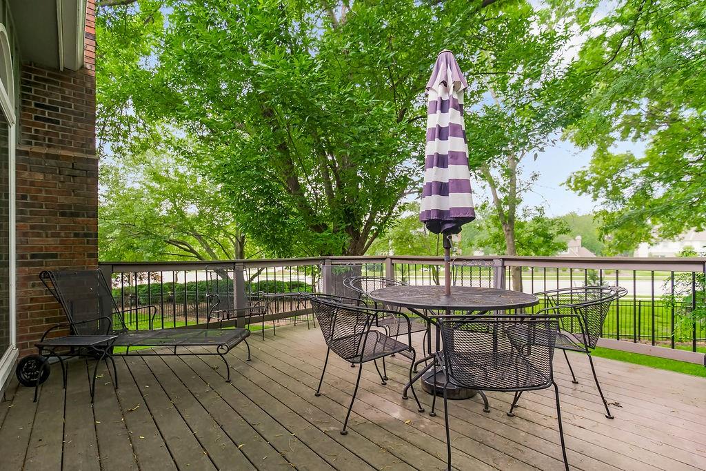 This classic 1.5-story home is custom-built and being sold by its original owner. Located on a tree-lined lot in the desirable Waterford community of Leawood, it features a timeless layout with generously sized rooms, formal dining, main-level laundry, and a side-entry garage. Though not recently updated, the home has been lovingly maintained - and with the right renovations, it has the potential to be truly spectacular. Inside, you'll find soaring ceilings, expansive windows, and natural light throughout. The main level offers a private library, a spacious primary suite with fireplace, a well-appointed laundry room, and a kitchen with center island, built-in appliances, and ample cabinetry. The grand room features vaulted ceilings and a built-in wet bar, perfect for entertaining. The hearth room flows into a sunny breakfast nook and opens to a large composite deck overlooking a park-like backyard. Upstairs includes a vaulted loft with skylights - ideal for a home office or creative retreat - plus spacious bedrooms with walk-in closets and Jack-and-Jill or private bath access. A private suite includes dual closets, one cedar-lined. The finished lower level features a rec room, wet bar, and flexible gathering space.