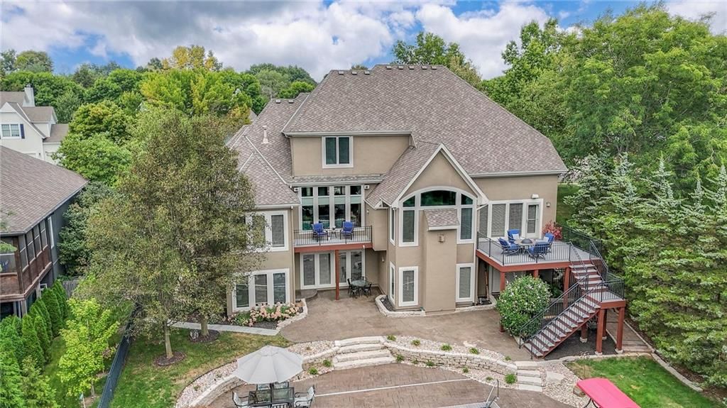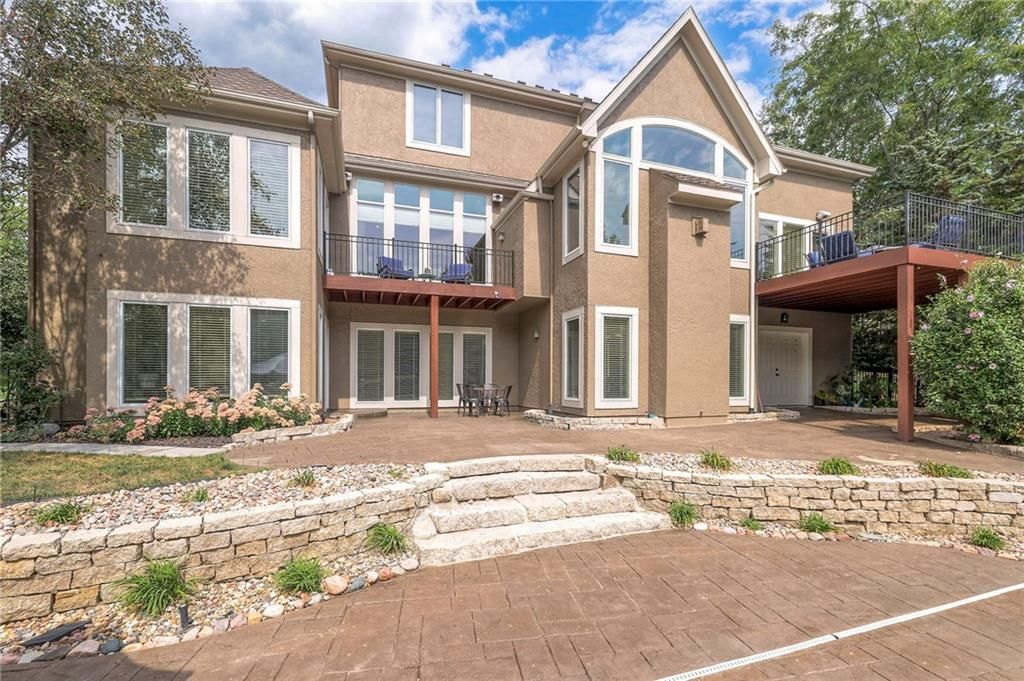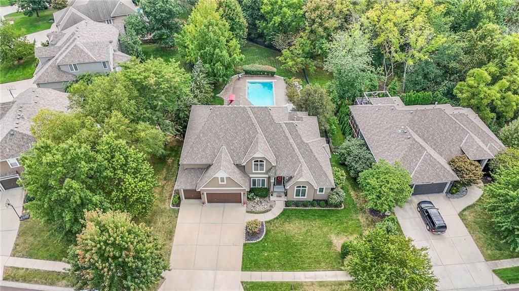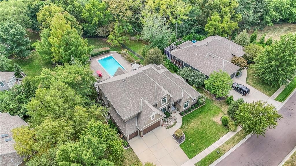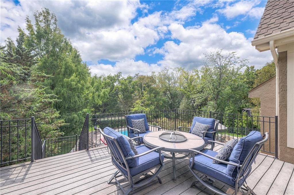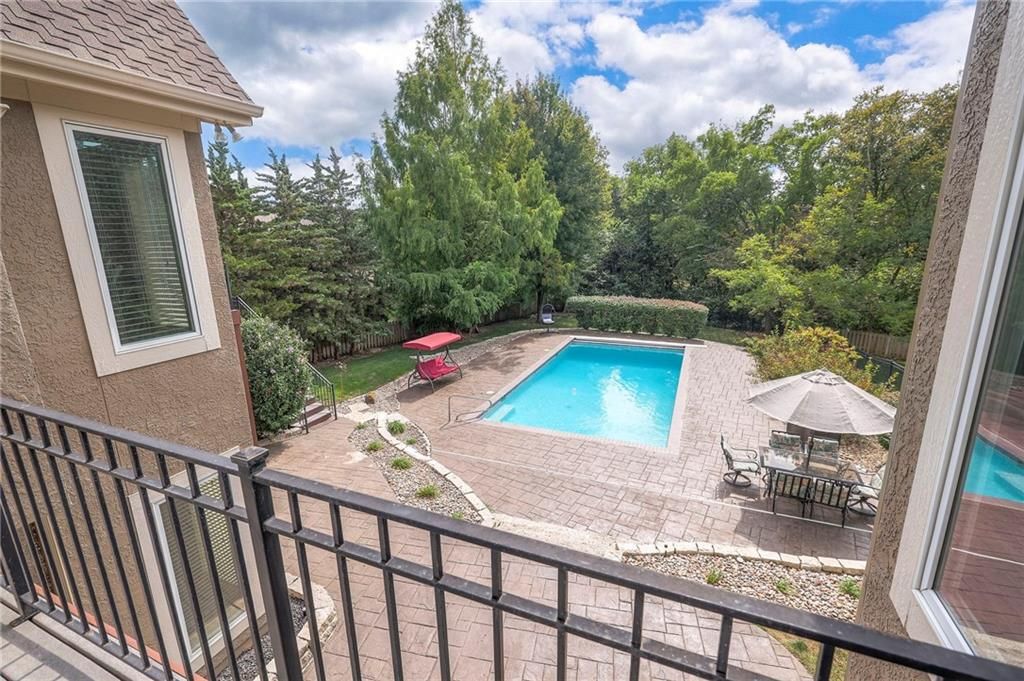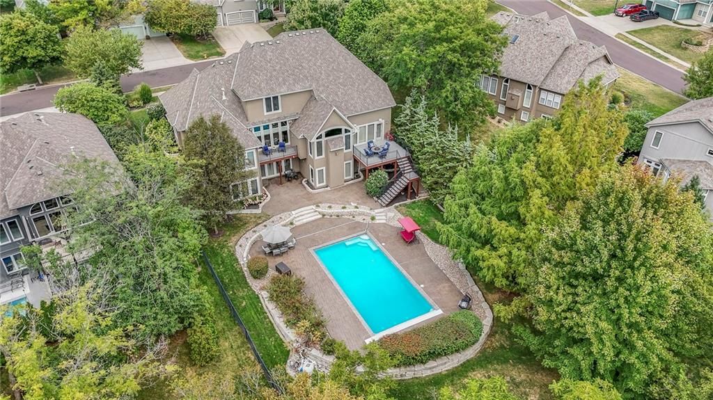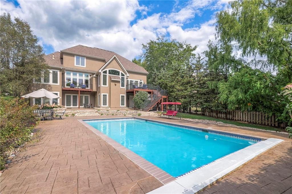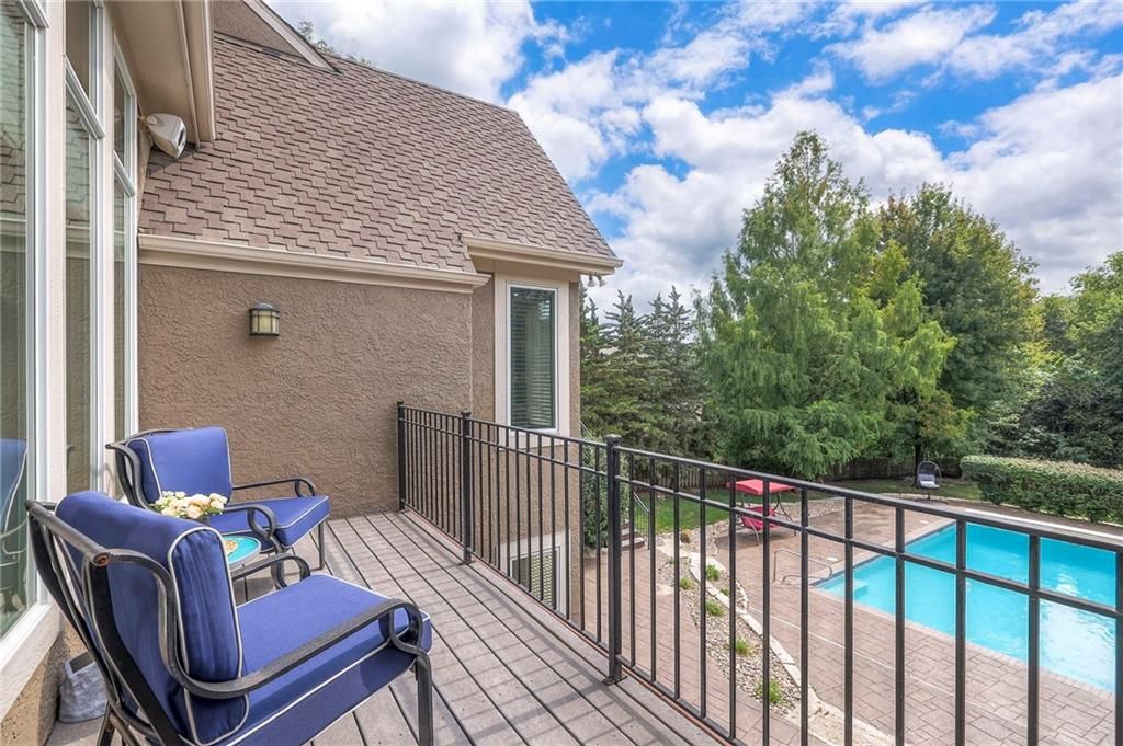 Welcome to this stunning 1.5-story home offering over 5,800 square feet of living space in a fantastic Overland Park location. The inviting entry opens to a formal dining room and home office, setting the tone for the amazing space throughout. The living room is warm and welcoming with vaulted ceilings, a cozy fireplace, and built-ins. The kitchen is truly the heart of the home, featuring an expansive island, double ovens, two sinks, a walk-in pantry, and generous countertop space. Just off the kitchen, a hearth room with its own fireplace and built-ins provides the perfect spot to gather. Step outside to a low-maintenance composite deck overlooking the private, treed backyard. The main-level primary suite is a retreat all its own, with a private balcony, spa-like ensuite bath featuring a walk-in shower and soaking tub, and a huge walk-in closet. A convenient laundry room rounds out the main floor. Upstairs, you'll find four spacious bedrooms, each with access to bathrooms and large closets. The finished walk-out basement is designed for entertaining, featuring a large rec room, a wet bar, and a separate space perfect for a pool table. A non-conforming sixth bedroom and abundant storage provide additional flexibility. Step outside to the backyard oasis, complete with a beautiful swimming pool, expansive patio, green space, and mature trees for privacy. This home is the complete package, spacious, functional, and perfect for both everyday living and entertaining.