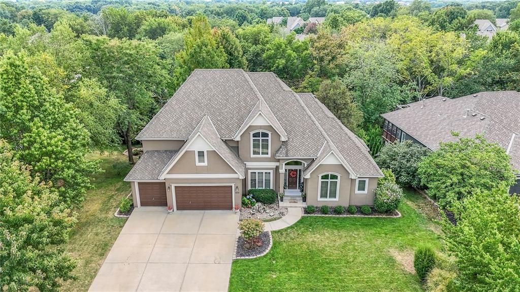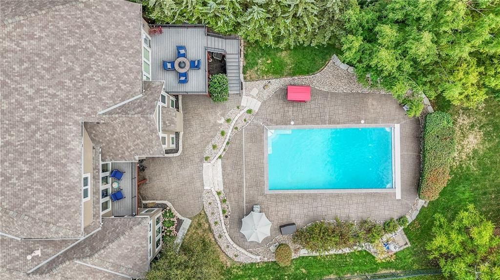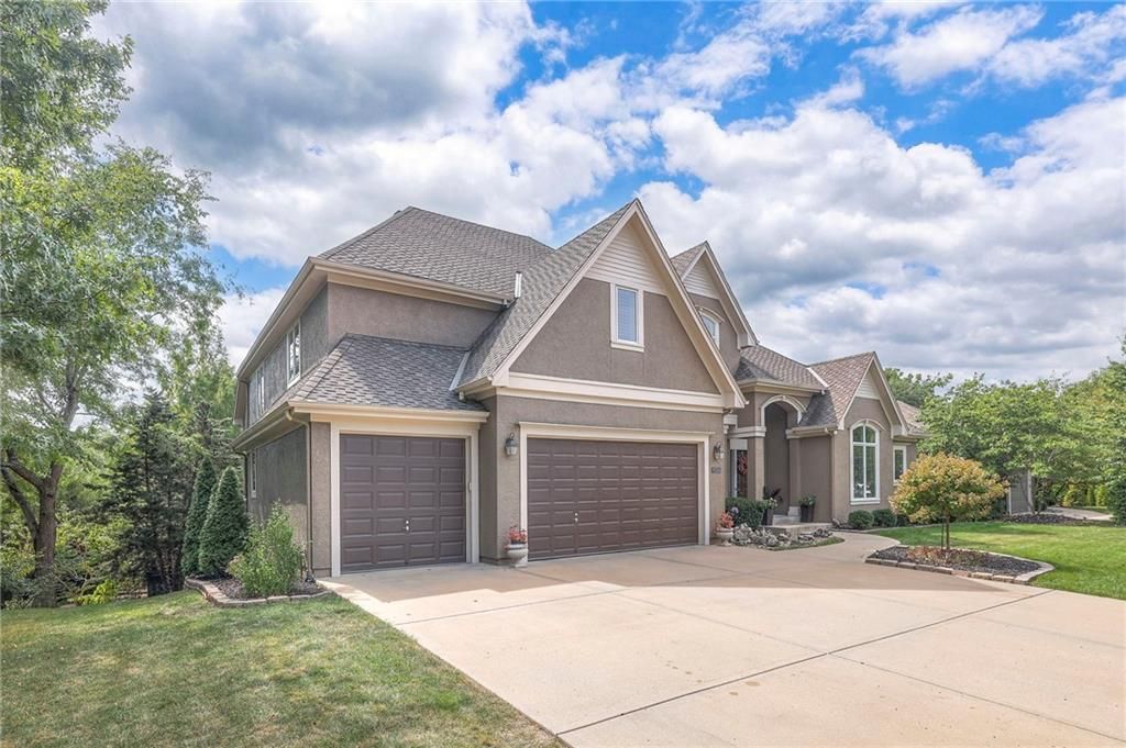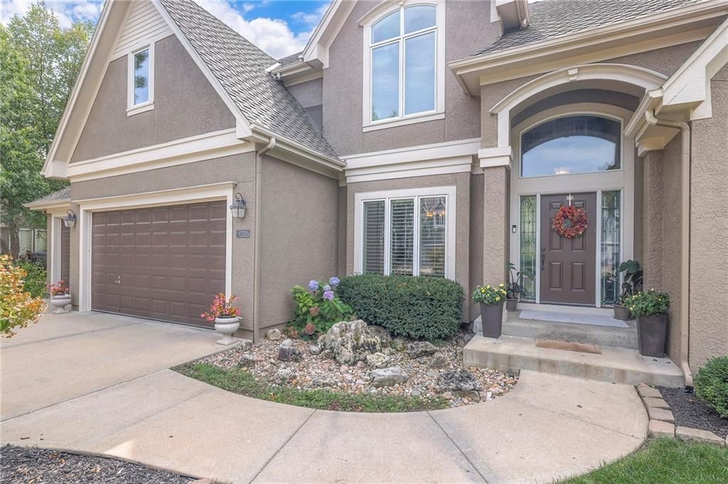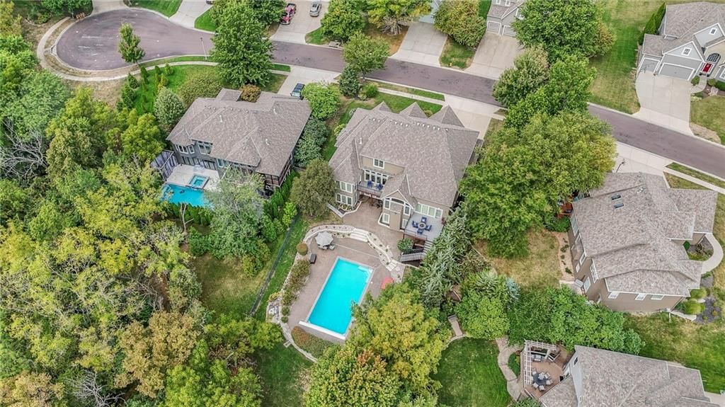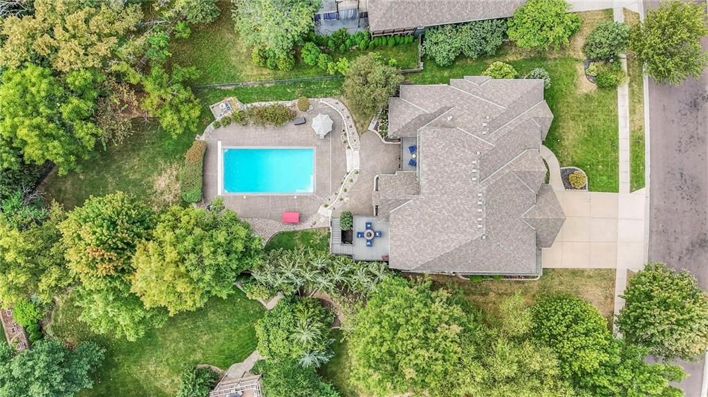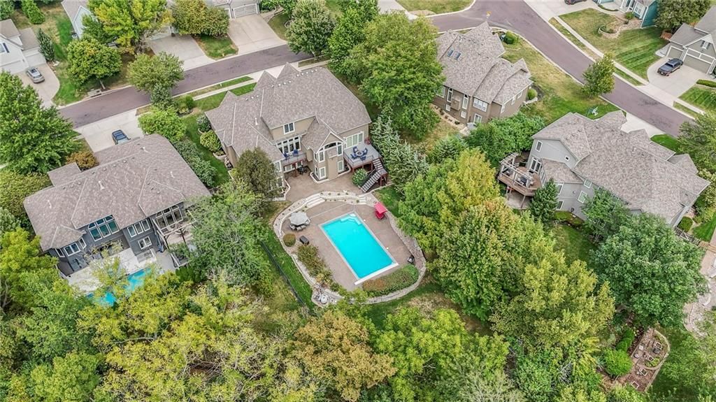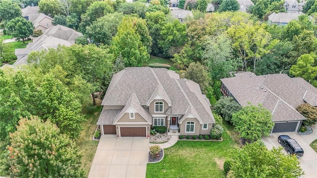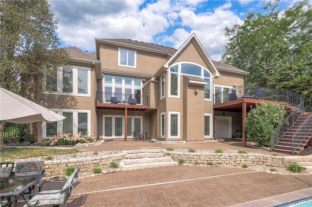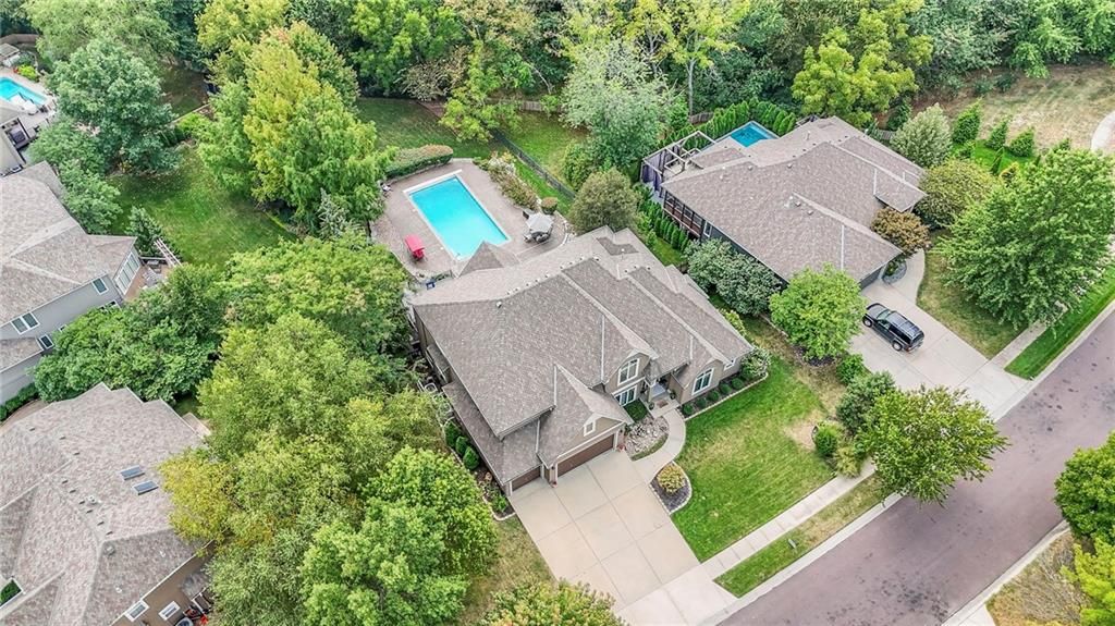 Welcome to this stunning 1.5-story home offering over 5,800 square feet of living space in a fantastic Overland Park location. The inviting entry opens to a formal dining room and home office, setting the tone for the amazing space throughout. The living room is warm and welcoming with vaulted ceilings, a cozy fireplace, and built-ins. The kitchen is truly the heart of the home, featuring an expansive island, double ovens, two sinks, a walk-in pantry, and generous countertop space. Just off the kitchen, a hearth room with its own fireplace and built-ins provides the perfect spot to gather. Step outside to a low-maintenance composite deck overlooking the private, treed backyard. The main-level primary suite is a retreat all its own, with a private balcony, spa-like ensuite bath featuring a walk-in shower and soaking tub, and a huge walk-in closet. A convenient laundry room rounds out the main floor. Upstairs, you'll find four spacious bedrooms, each with access to bathrooms and large closets. The finished walk-out basement is designed for entertaining, featuring a large rec room, a wet bar, and a separate space perfect for a pool table. A non-conforming sixth bedroom and abundant storage provide additional flexibility. Step outside to the backyard oasis, complete with a beautiful swimming pool, expansive patio, green space, and mature trees for privacy. This home is the complete package, spacious, functional, and perfect for both everyday living and entertaining.