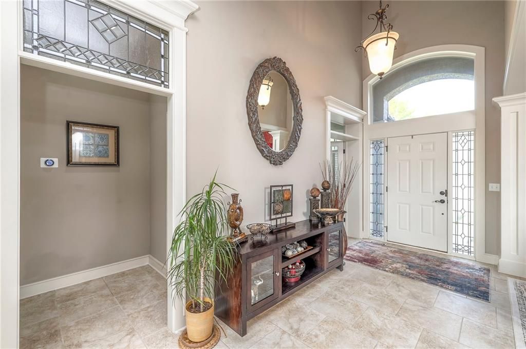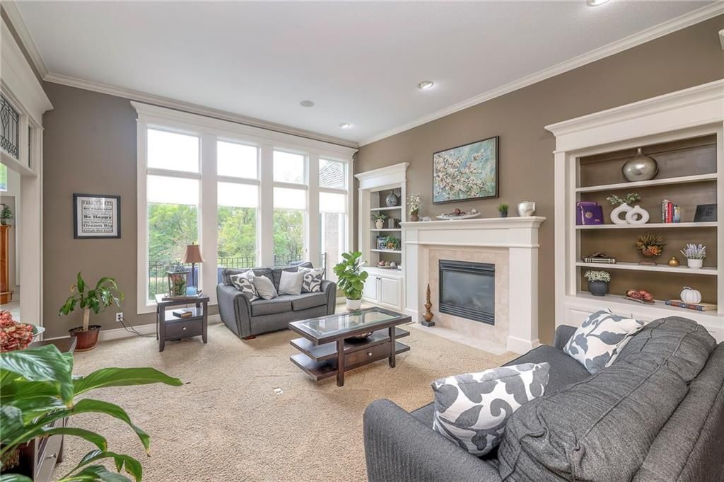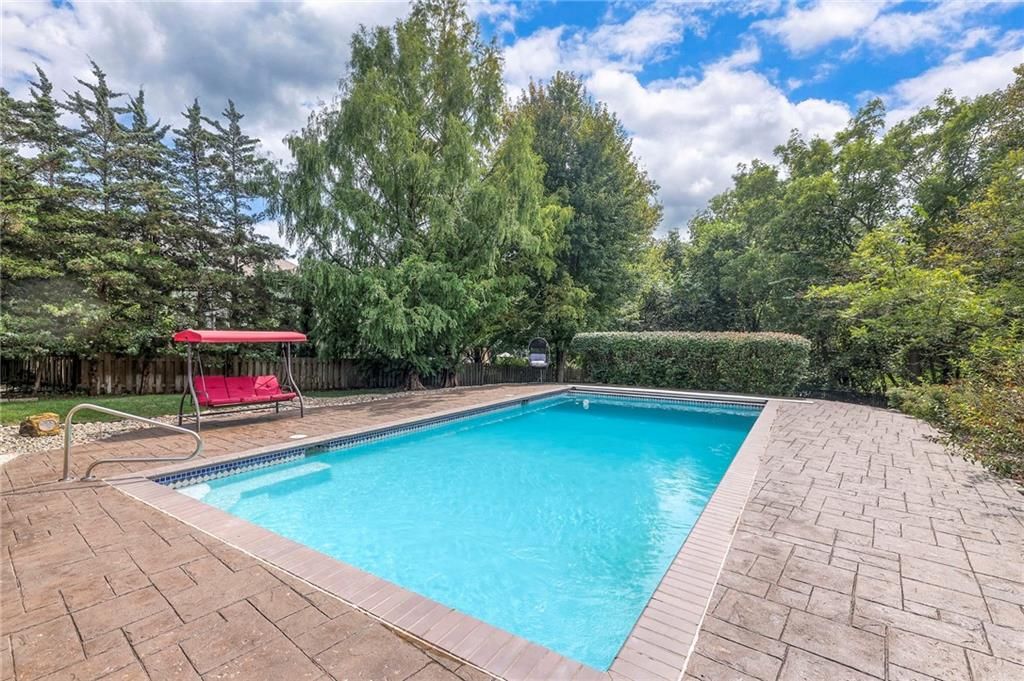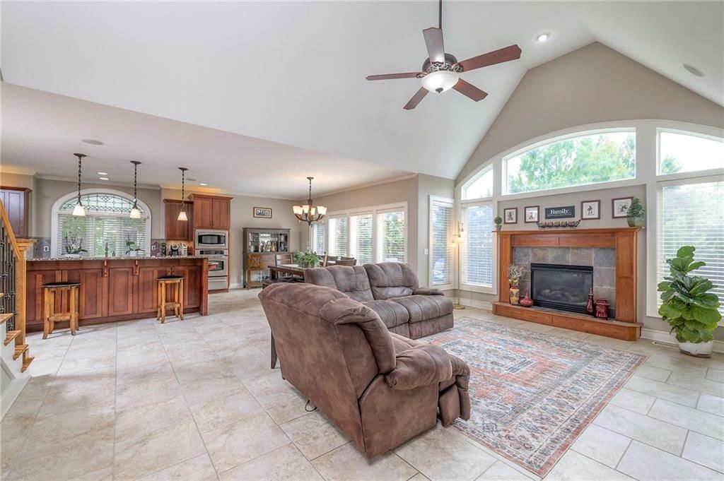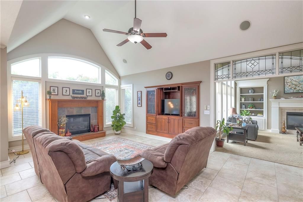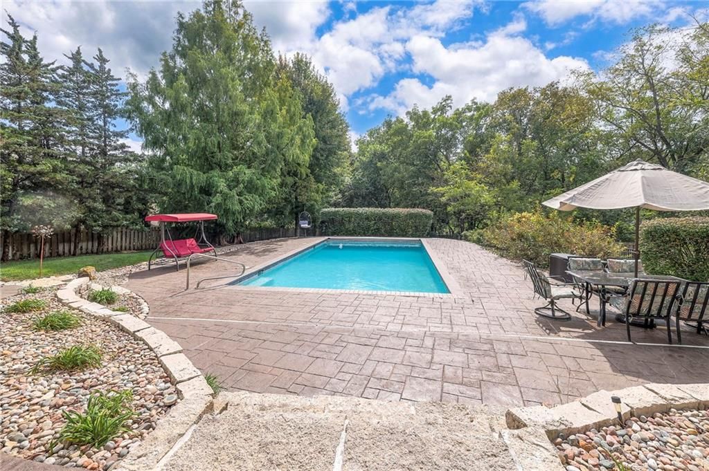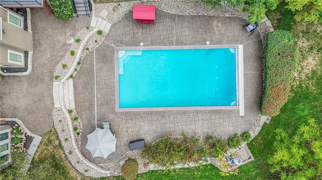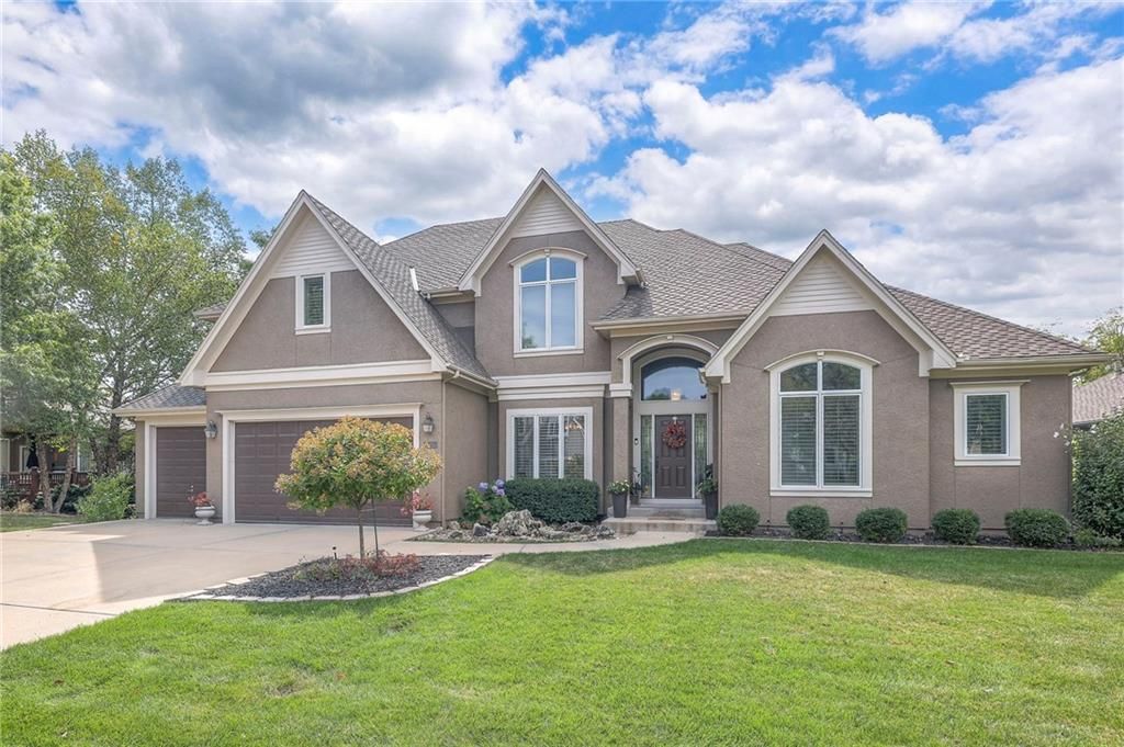 Welcome to this stunning 1.5-story home offering over 5,800 square feet of living space in a fantastic Overland Park location. The inviting entry opens to a formal dining room and home office, setting the tone for the amazing space throughout. The living room is warm and welcoming with vaulted ceilings, a cozy fireplace, and built-ins. The kitchen is truly the heart of the home, featuring an expansive island, double ovens, two sinks, a walk-in pantry, and generous countertop space. Just off the kitchen, a hearth room with its own fireplace and built-ins provides the perfect spot to gather. Step outside to a low-maintenance composite deck overlooking the private, treed backyard. The main-level primary suite is a retreat all its own, with a private balcony, spa-like ensuite bath featuring a walk-in shower and soaking tub, and a huge walk-in closet. A convenient laundry room rounds out the main floor. Upstairs, you'll find four spacious bedrooms, each with access to bathrooms and large closets. The finished walk-out basement is designed for entertaining, featuring a large rec room, a wet bar, and a separate space perfect for a pool table. A non-conforming sixth bedroom and abundant storage provide additional flexibility. Step outside to the backyard oasis, complete with a beautiful swimming pool, expansive patio, green space, and mature trees for privacy. This home is the complete package, spacious, functional, and perfect for both everyday living and entertaining.