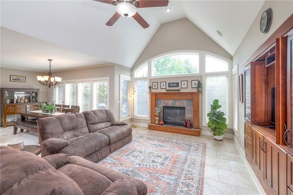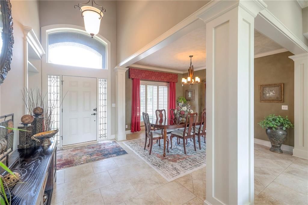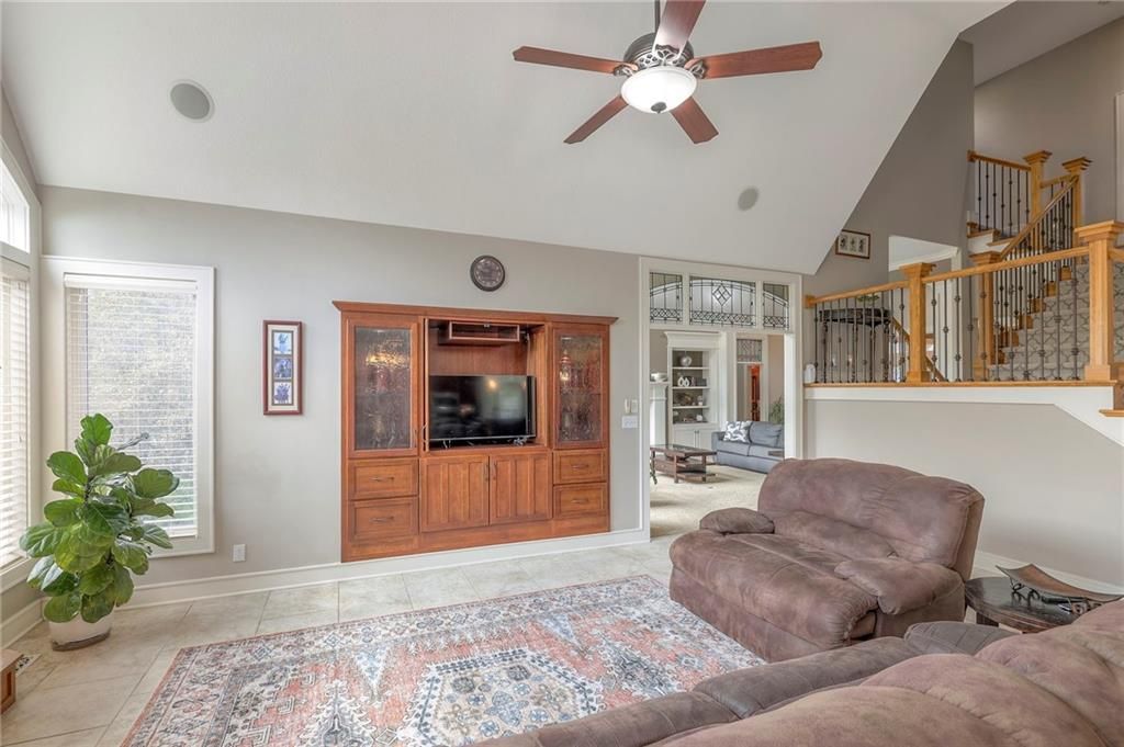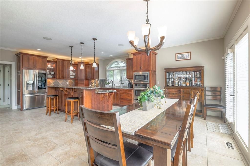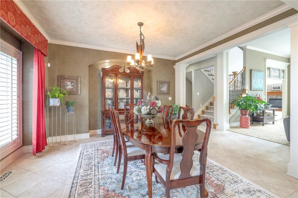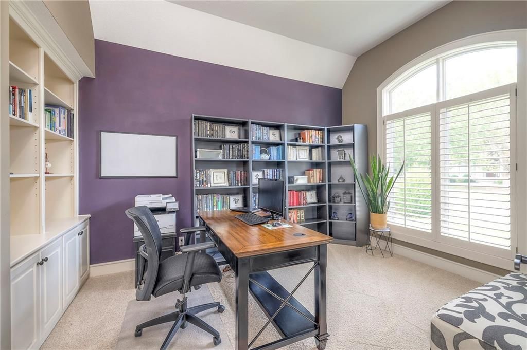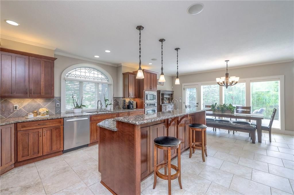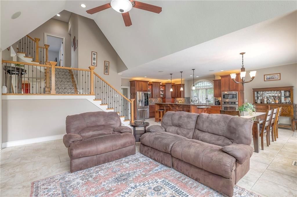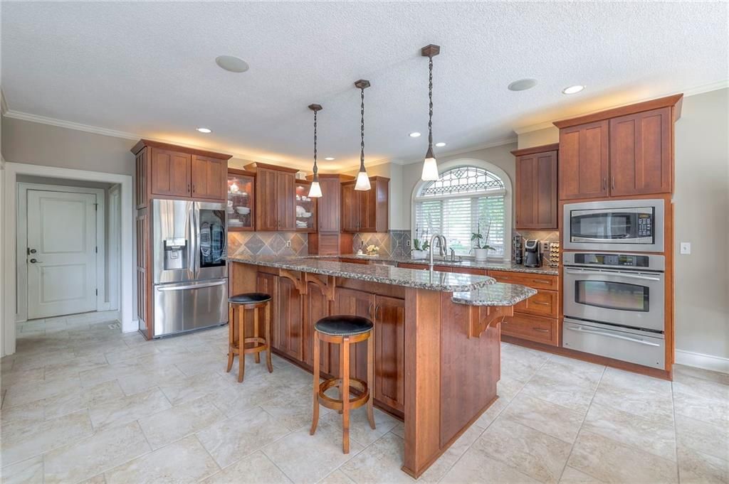 Welcome to this stunning 1.5-story home offering over 5,800 square feet of living space in a fantastic Overland Park location. The inviting entry opens to a formal dining room and home office, setting the tone for the amazing space throughout. The living room is warm and welcoming with vaulted ceilings, a cozy fireplace, and built-ins. The kitchen is truly the heart of the home, featuring an expansive island, double ovens, two sinks, a walk-in pantry, and generous countertop space. Just off the kitchen, a hearth room with its own fireplace and built-ins provides the perfect spot to gather. Step outside to a low-maintenance composite deck overlooking the private, treed backyard. The main-level primary suite is a retreat all its own, with a private balcony, spa-like ensuite bath featuring a walk-in shower and soaking tub, and a huge walk-in closet. A convenient laundry room rounds out the main floor. Upstairs, you'll find four spacious bedrooms, each with access to bathrooms and large closets. The finished walk-out basement is designed for entertaining, featuring a large rec room, a wet bar, and a separate space perfect for a pool table. A non-conforming sixth bedroom and abundant storage provide additional flexibility. Step outside to the backyard oasis, complete with a beautiful swimming pool, expansive patio, green space, and mature trees for privacy. This home is the complete package, spacious, functional, and perfect for both everyday living and entertaining.