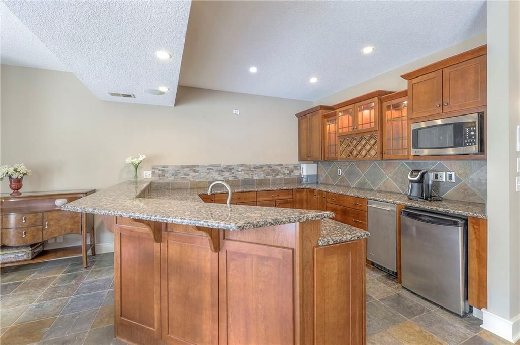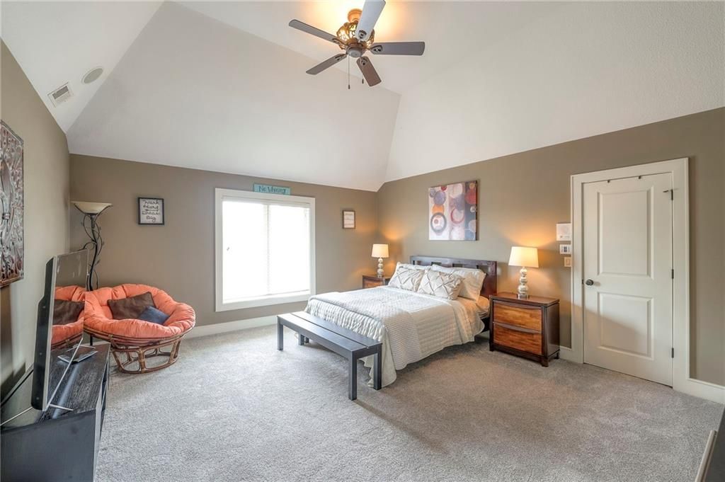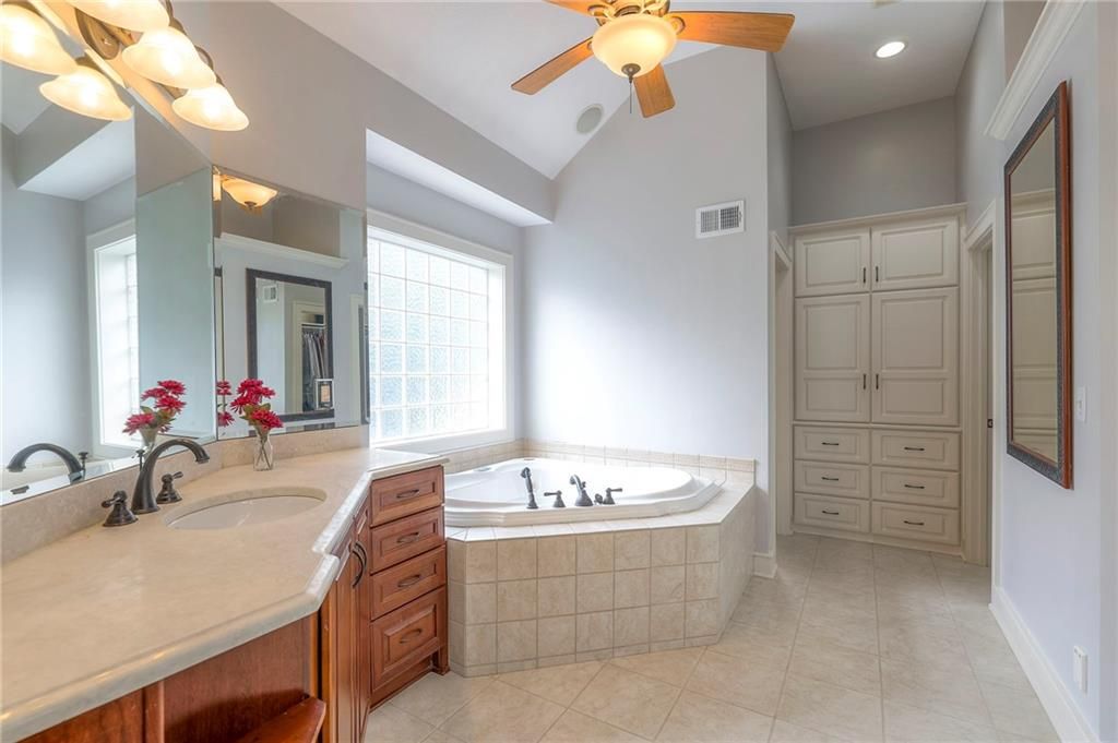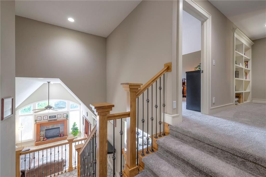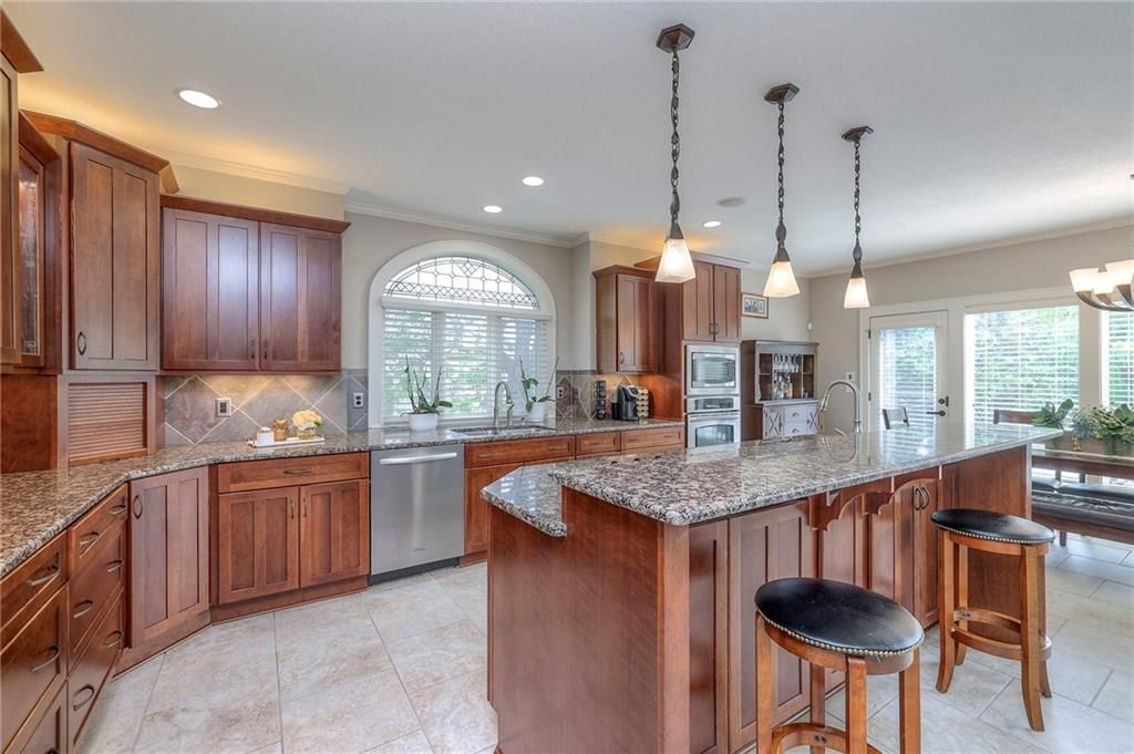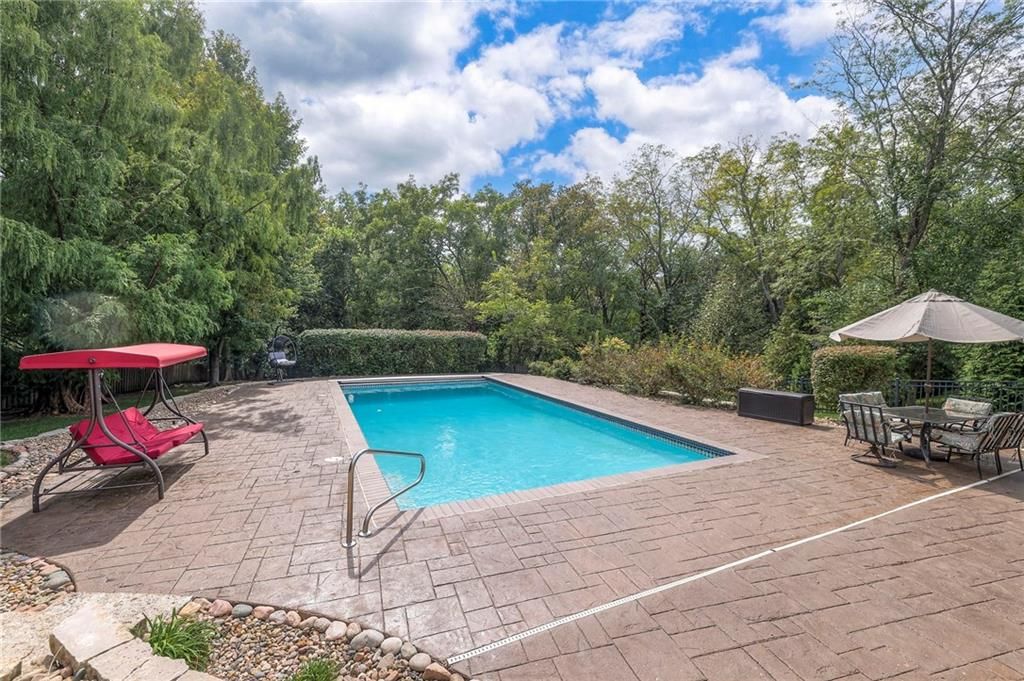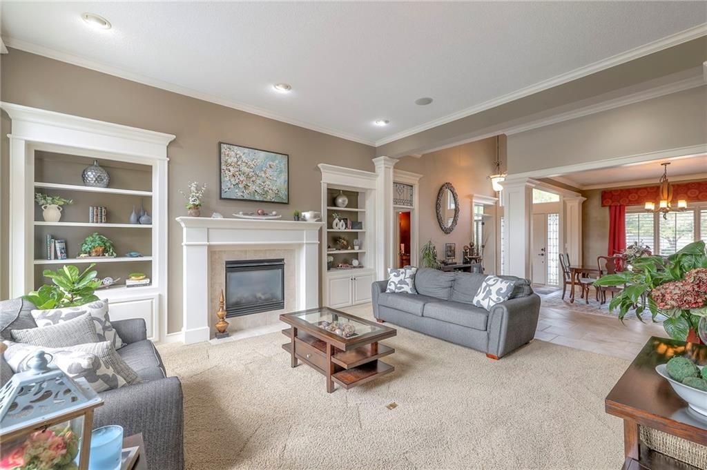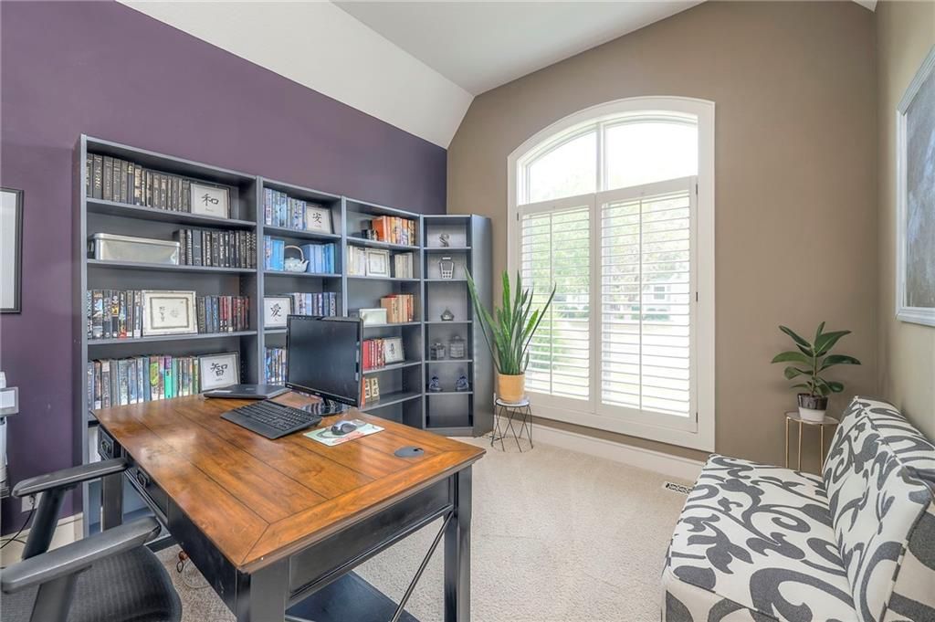 Welcome to this stunning 1.5-story home offering over 5,800 square feet of living space in a fantastic Overland Park location. The inviting entry opens to a formal dining room and home office, setting the tone for the amazing space throughout. The living room is warm and welcoming with vaulted ceilings, a cozy fireplace, and built-ins. The kitchen is truly the heart of the home, featuring an expansive island, double ovens, two sinks, a walk-in pantry, and generous countertop space. Just off the kitchen, a hearth room with its own fireplace and built-ins provides the perfect spot to gather. Step outside to a low-maintenance composite deck overlooking the private, treed backyard. The main-level primary suite is a retreat all its own, with a private balcony, spa-like ensuite bath featuring a walk-in shower and soaking tub, and a huge walk-in closet. A convenient laundry room rounds out the main floor. Upstairs, you'll find four spacious bedrooms, each with access to bathrooms and large closets. The finished walk-out basement is designed for entertaining, featuring a large rec room, a wet bar, and a separate space perfect for a pool table. A non-conforming sixth bedroom and abundant storage provide additional flexibility. Step outside to the backyard oasis, complete with a beautiful swimming pool, expansive patio, green space, and mature trees for privacy. This home is the complete package, spacious, functional, and perfect for both everyday living and entertaining.