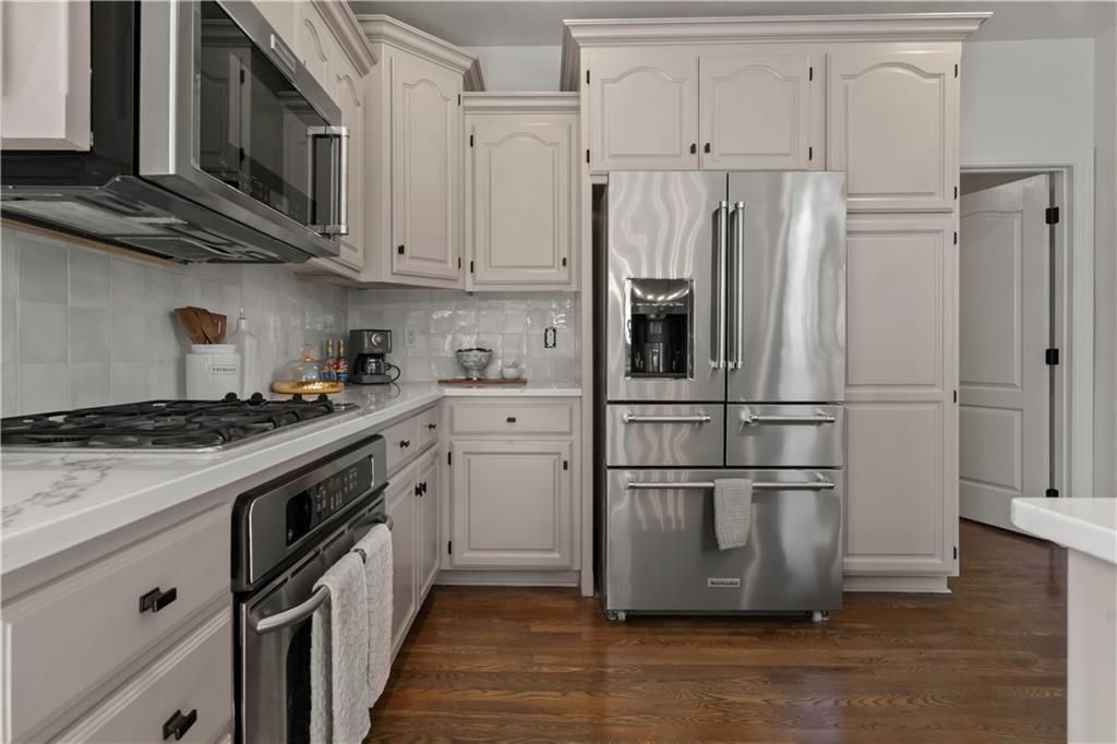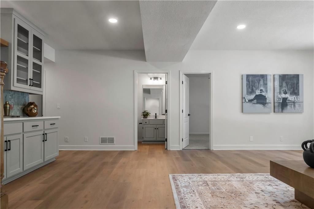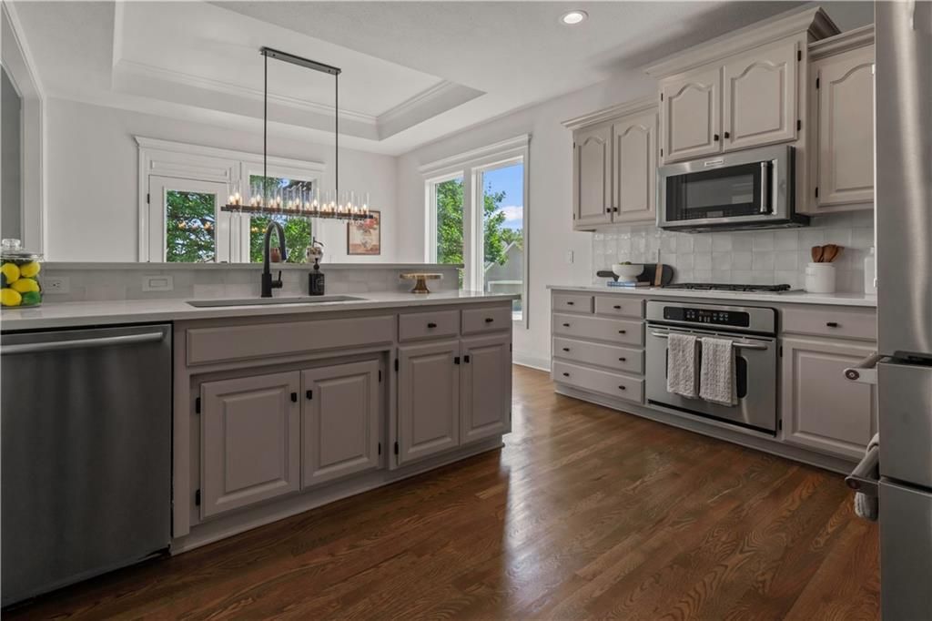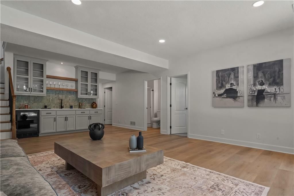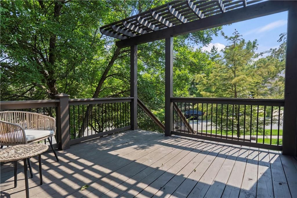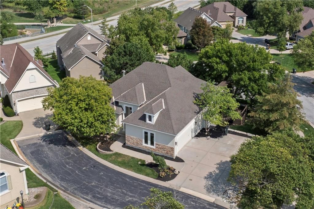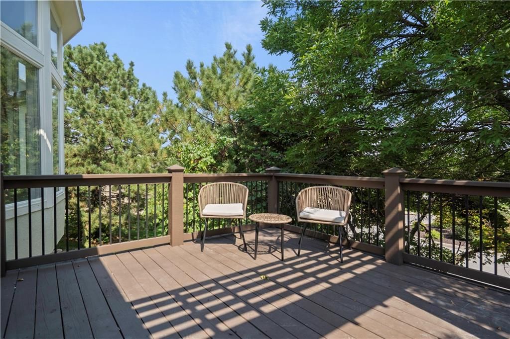GORGEOUS, COMPLETELY REMODELED PATIO VILLA IN CAMDEN WOODS - BLUE VALLEY SCHOOL DISTRICT! Step inside to discover beautifully refinished hardwood floors flowing seamlessly through the main living areas. The inviting Great Room boasts a wall of windows that fill the space with natural light, plus a central fireplace for cozy nights in. Chef's kitchen is sure to impress with quartz countertops, eat-in peninsula, stainless steel appliances (ALL STAY!) and a pantry with pull-out drawers. An adjacent dining area opens to the deck - perfect for entertaining or simply relaxing outdoors. Main level features two bedrooms with walk-in closets, including a luxurious primary suite with spa-like en-suite showcasing a double vanity, soaking tub and separate glass-surround shower. The second bedroom, with French doors and direct bath access, makes an ideal guest room or home office. Full, finished walk-out lower level expands your living space with a bright family room and wet bar, two additional bedrooms, a third full bath and a bonus flex room - ideal for a wine cellar, pocket office, craft space, or workout room. Enjoy the ease of maintenance-free living in a premier location just minutes from parks, golf, shopping, dining, and more. Welcome home to Camden Woods - where style, comfort, and convenience come together!