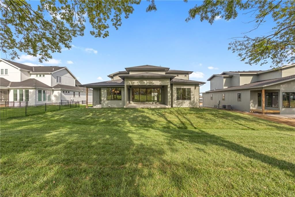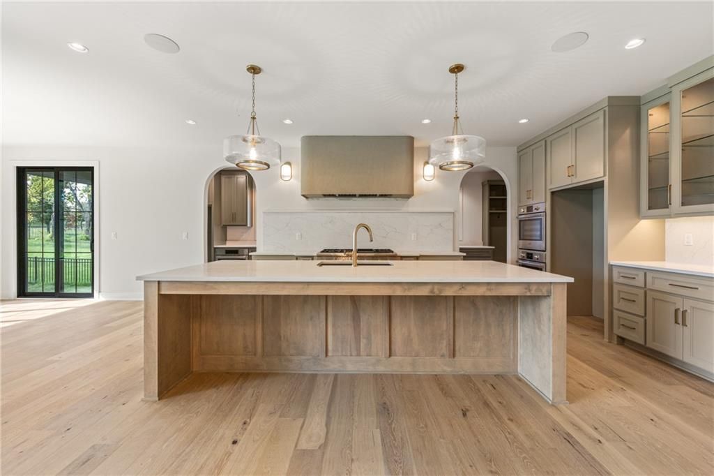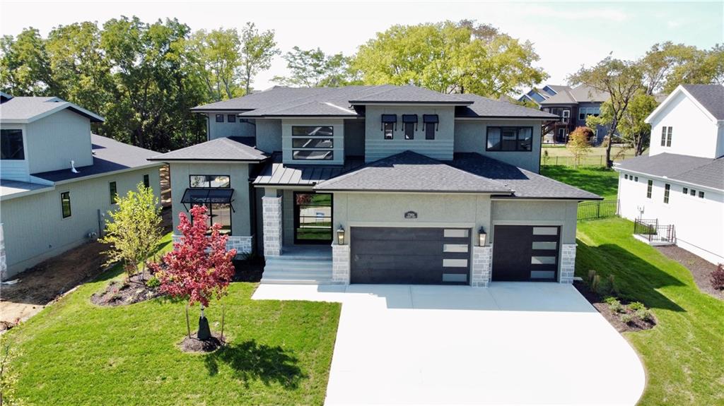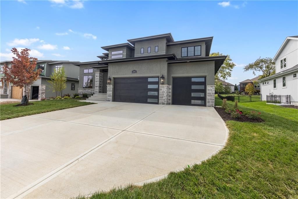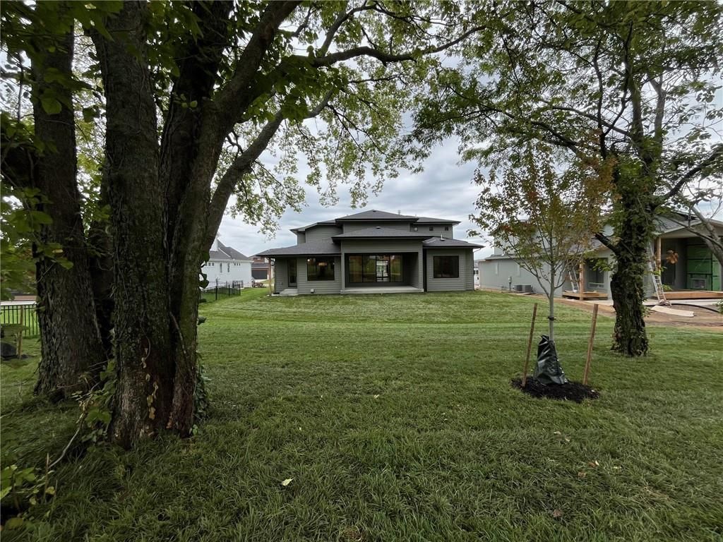 The stunning Roosevelt 1.5 Story by Bickimer is READY FOR MOVE IN on Lot 210 backing to green space with large trees. A truly unique floor plan and so many reasons to fall in love with this home. Features include: Curved open staircase, huge oversized modern black and clear glass front door that pivots open, premium RHINO black windows, long mud hall with door to the back yard, prep pantry hallway, main floor office, stunning kitchen with drop in Thermador range with griddle, upgraded curved wood vent hood, upstairs loft, reading nook, atrium style dinning room with large windows. This plan is a unique layout with grand two story great room with cast concrete fireplace and wood accent ceiling beams. Unique mud room hallway that passes through the pantry with a door out to 7' X 7' grill patio. Optional finished basement can be added with wet bar and stunning mid century modern TV accent feature wall with wood panels as photos from previous model home. All situated on a level lot with patio slider doors to a 12' X 19' covered patio to enjoy your back yard BBQ's and events with ease from the main level. Stucco exterior with real stone trim. Century Farms has a beautiful club house with fitness center and reading loft, pool with slide and fire pit, pickleball courts, kids play area and community garden. Come join the fun in Century Farms, a unique one of a kind upscale community in Overland Park. BLUE VALLEY SCHOOLS *Some photos are from a previous model home*