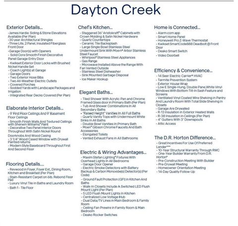 Experience modern elegance in Dayton Creek with this D.R. Horton home. This home is equipped with a 3-car garage, James Hardie siding with stone accents, 9' ceilings, and RevWood flooring throughout the main living areas. The chef's kitchen features quartz countertops, tile backsplash, and Whirlpool stainless steel appliances. Retreat to a luxurious primary suite with tiled shower and double quartz vanity. Cutting-edge Smart Home technology makes daily living effortless. Energy-efficient systems, garage door openers and a covered porch with landscaped yard make this home the perfect blend of comfort, technology, and style. With D.R. Horton, you get a home warranty, the most recent building codes, more energy efficiency and lower maintenance. Don't forget to ask about current incentives! Photos, renderings, and 3D Walkthrough's maybe of a different home but on the same floor plan to show finish quality only.** Don't miss your chance - schedule a tour today and see why this home is the perfect mix of luxury and convenience!
