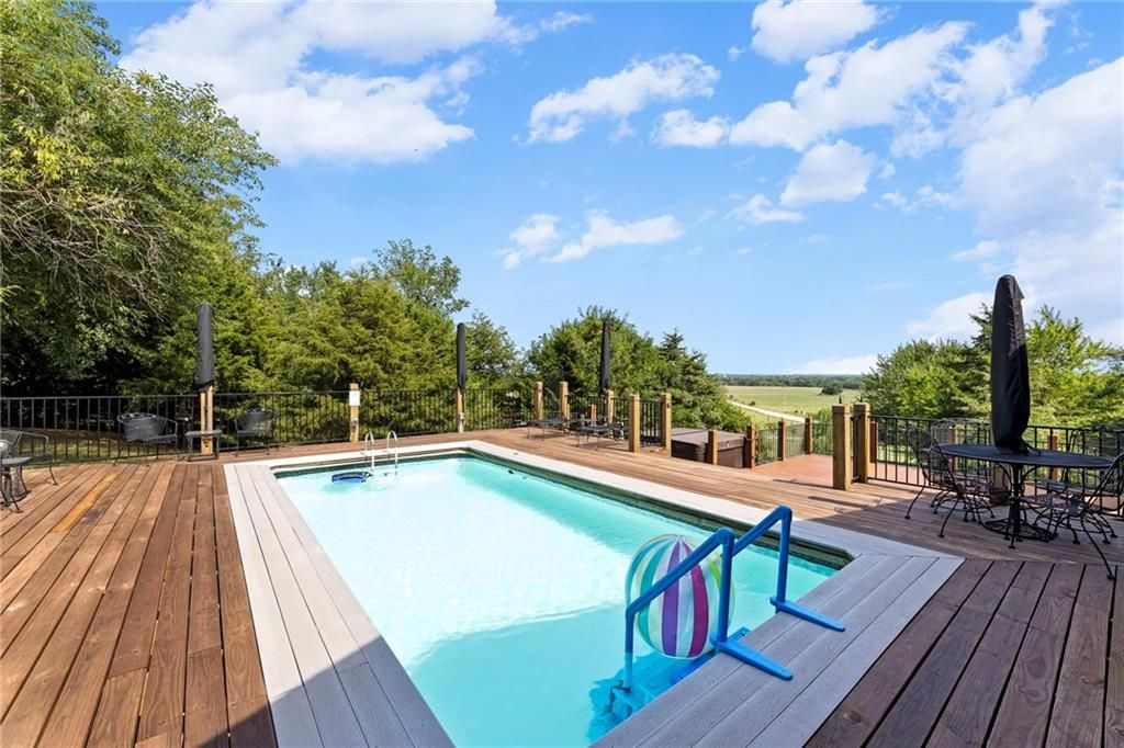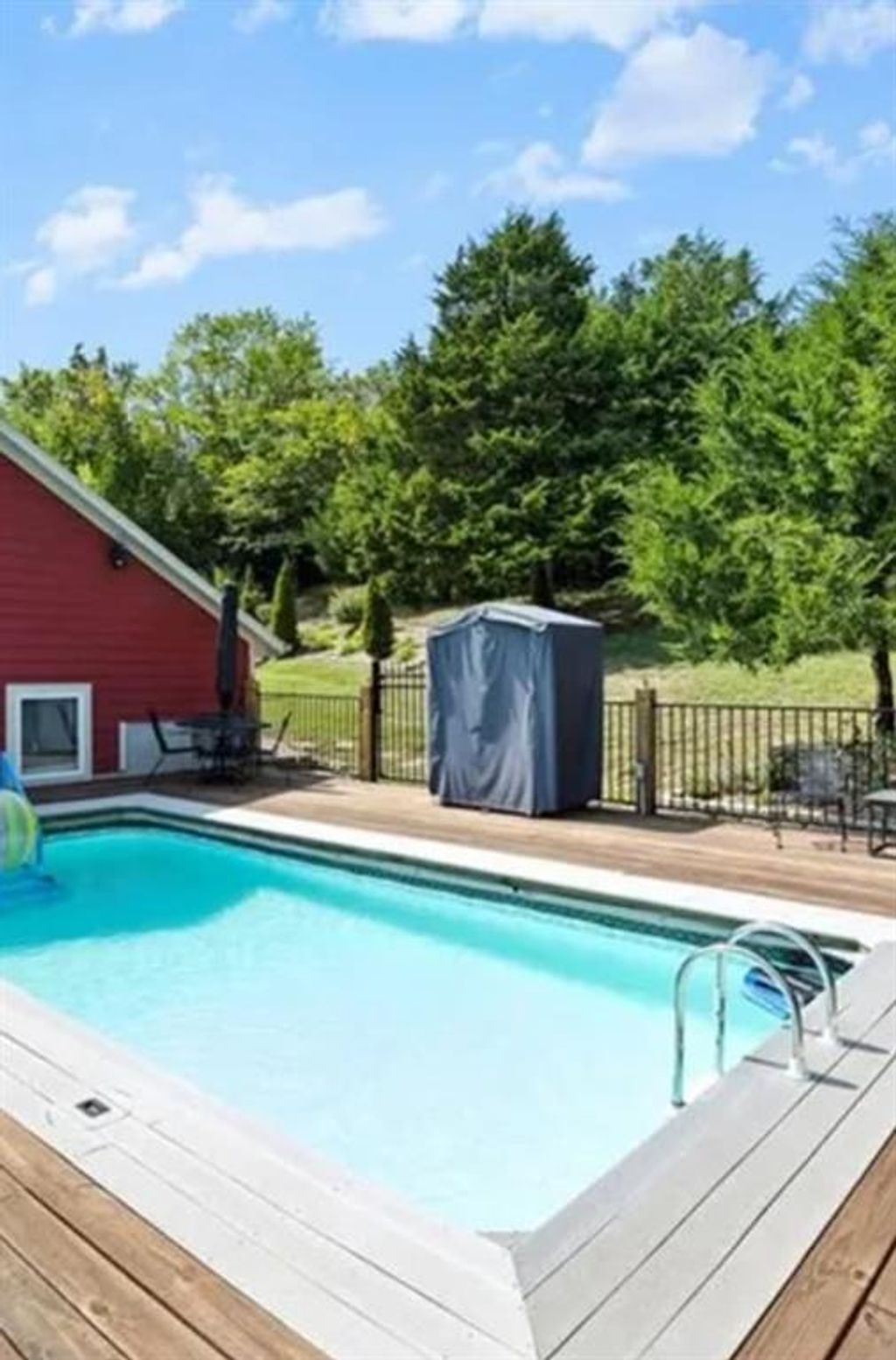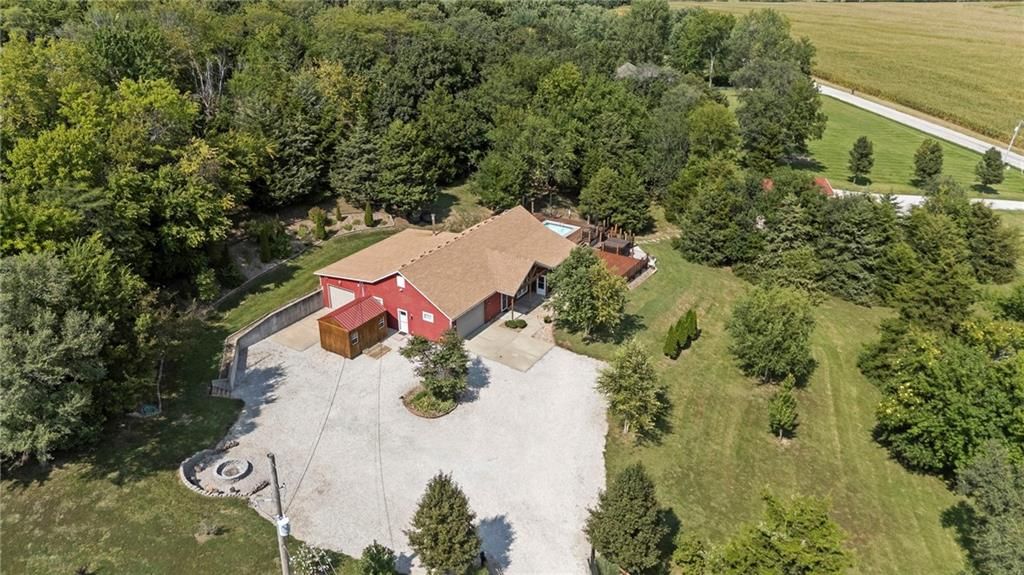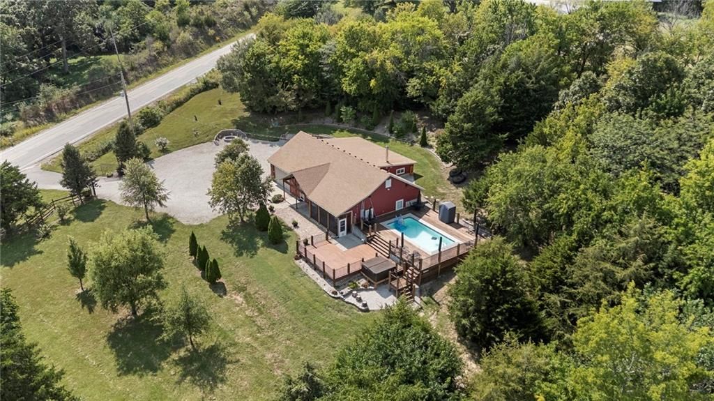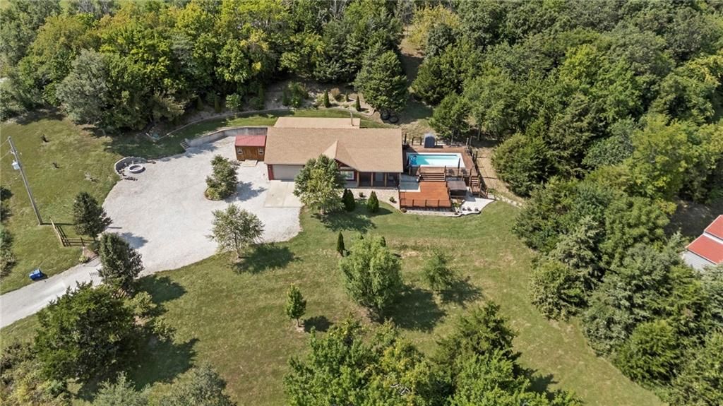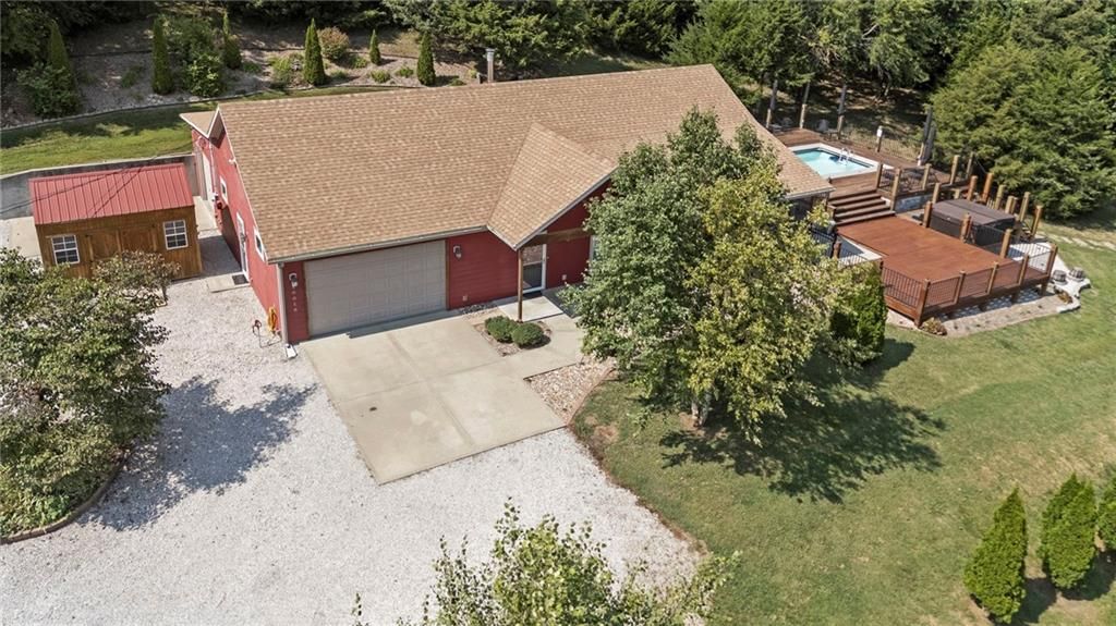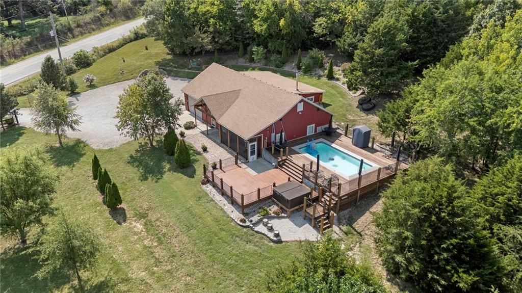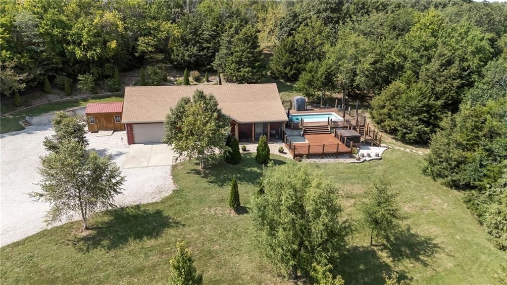 Welcoming wrought iron entrance gates, Cedar trim, this exquisite 3 Bedroom home perched on the side of a hill overlooking beautiful views for every season on a corner lot 1.5 miles from town on blacktop. The exceptional finishes in this home flow with Travertine tile floors and Granite countertops throughout, stainless kitchen sink, stove, microwave, refrigerator and dishwasher, Quartz backsplash, Jacuzzi bath, vessel sinks and new faucets, finished garages, multipurpose rooms, wood stove for those cold cozy nights. Electric LED fireplace, built in bookshelves and china cabinet, insulated interior walls for sound barrier, numerous closets finished for organization, wood doors, trim and cabinets. This multifunctional bathroom has 3 separate rooms! Storage with a drop-down ladder with extra attic space and shelving above the garage. For entertainment the screened porch, sauna, hot tub and inground/above ground 52"h/48"d 12'x24' pool with a simple filter pump for easy care, wrapped with wood decks and wrought iron rails, a luxury 6' Firepit, Horseshoe pit, chicken runs with hen houses. A 2nd entrance to the Estate with an outbuilding newly added in 2022, equipped with 100 amp electric breaker box. 3 30/50 amp hookups for camper or boat. 4 miles to Hillsdale Lake or lake Miola. This 1500+ sq ft home is trimmed in switched lights with remote for different seasons, different colors or themes. Floodlights around along with a camera surveillance system including a monitor and 8 night vison cameras inside and out that can be monitored on your mobile phone while away. Plenty of Woods and View! You must see this higher quality home built for the Builder himself! This home is move in ready and has been very well kept with lots of mature landscape. Several flowering, colorful bushes and trees throughout the Seasons. It's like a new home without the wait time! A must see to appreciate!