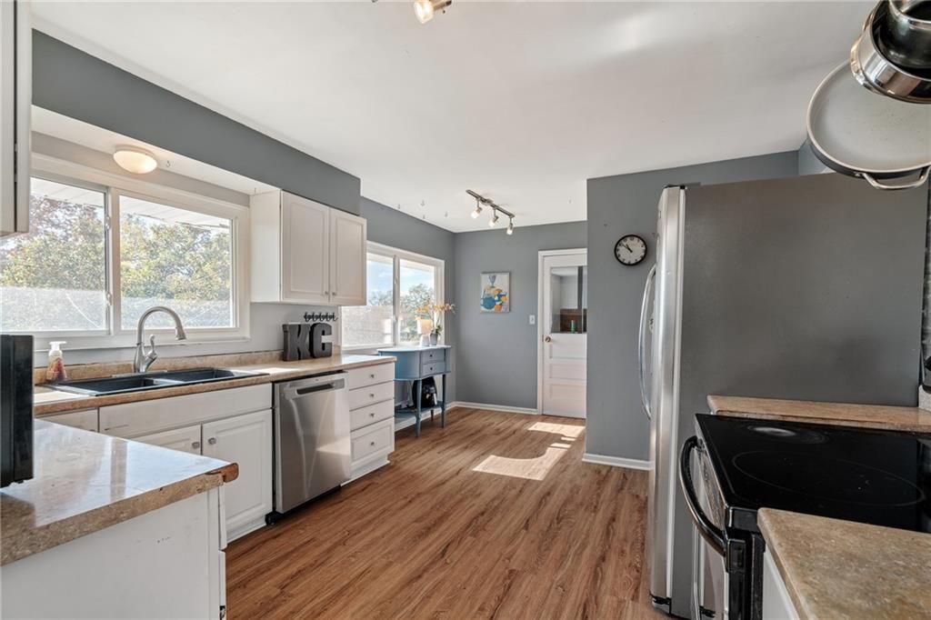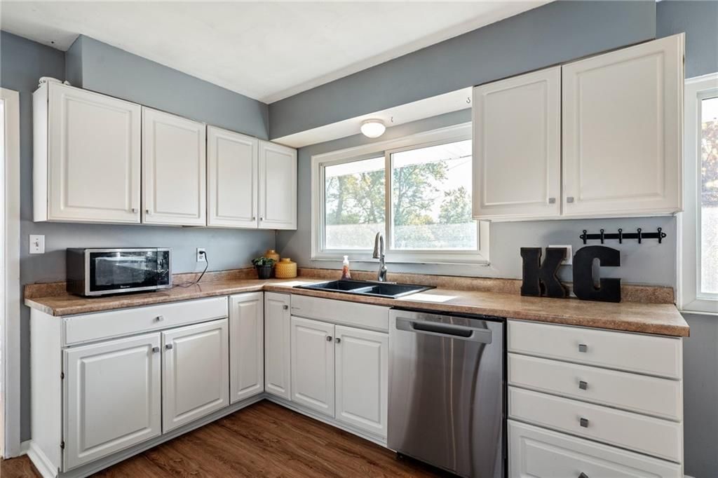 Back on the market at no fault to seller. You'll be thanking your lucky stars that you found this spacious 4-bedroom, 1.5-bath ranch home, nestled on a large, private cul-de-sac lot. Three bedrooms on the main level, fourth bedroom in lower level. The home features gleaming hardwood floors in living and dining areas, kitchen has new vinyl plank flooring offering warmth and elegance. Imagine cooking a pot of chili in the fully equipped kitchen with breakfast eating area overlooking the backyard. The open floor plan flows seamlessly, making it ideal for both daily living and entertaining. Unfinished lower level with daylight windows offers many opportunities to make your own finishes. Enjoy the convenience of a two-car garage, providing ample storage space. Outside, the expansive yard offers endless possibilities for outdoor activities, gardening, or even adding custom landscaping to suit your tastes. Location is unsurpassed for convenience to shopping, restaurants, schools, the Plaza and easy hiway access. This move-in-ready gem is perfect for those seeking single-level living, privacy, and space to grow. Don t miss out schedule your showing today!
